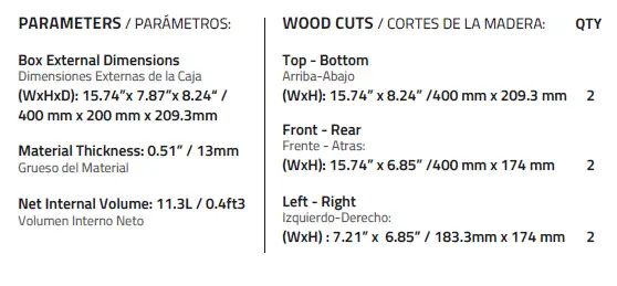 (WxHxD): 19.68” x 7.87” x 9.71“ / 500 mm x 200 mm x 246.7 mm - Material Thickness: 0.51” / 13mm