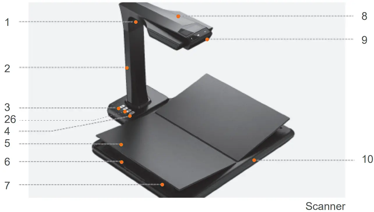 - Check the LCD on the head portion to see if the black area of the V-shaped book rest covers the entire screen and ensure that the desk surface or random edges are not included within the scan.
