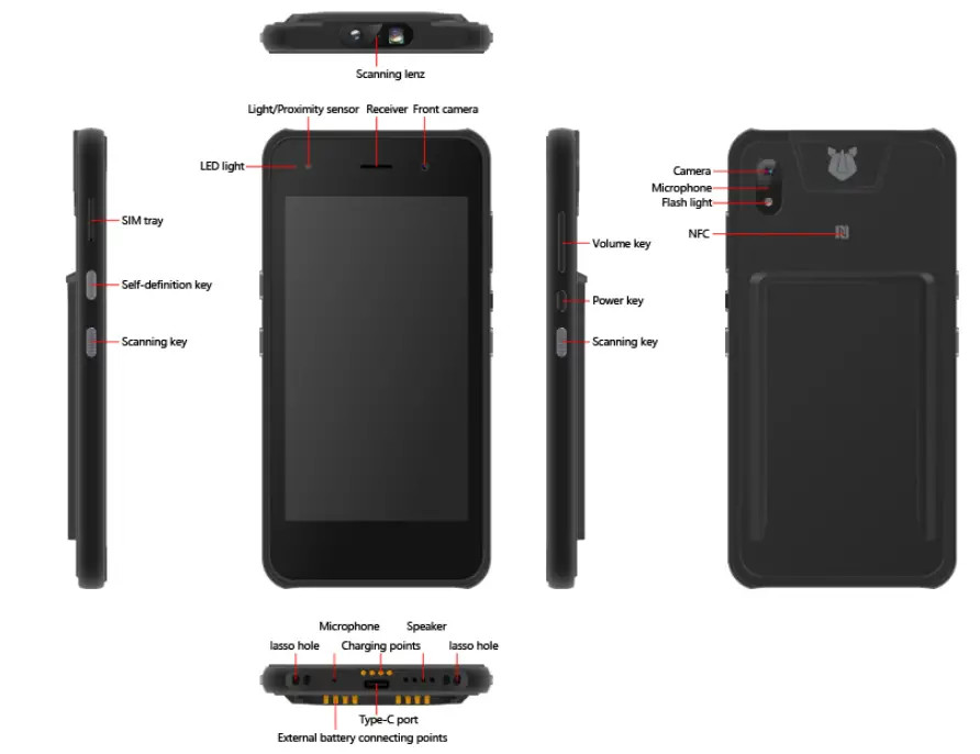 | Power | Located on right of the device. Long press on the button when off to turn on or to open the menu of “Power off & Restart” when on. Short press when on to switch the display in and out of sleep. |
