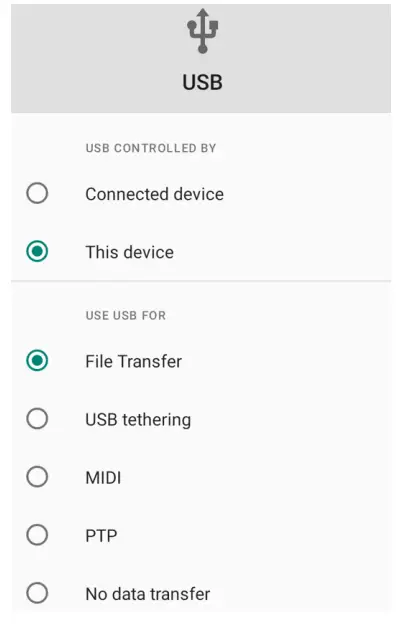 Should you want to transfer music, pictures, or other files to or from device storage via a computer, you must set “Use USB to” to Transfer Files: