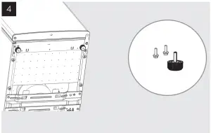 There are two leveling feet on the bottom of the unit near the unit front. Turn the leveling foot knobs to the left to raise the cabinet, and to the right to lower the cabinet.