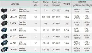| Optional lens | FL-720 (Ultra short throw fixed lens) ML-713 (Middle throw lens) USL-701 (Ultra short throw lens) LL-704 (Long throw lens) FL-701 (Fixed short throw lens) UL-705 (Ultra long throw lens) SL-712 (Short throw lens) | ||||