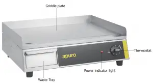 Note: Apuro recommend the cooking surface is lightly oiled before cooking. - Place the foodstuffs on the griddle plate and cook as required.