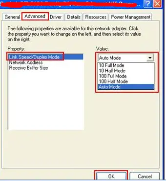 2)As to the ‘connection speed’ in the NIC of the PC, usually you can change the speed by changing the ‘media type’ (‘media type’ or ‘speed and duplex’ or ‘link speed and duplex’): go to ’local area connection’—right click it and go to ‘properties’—’ configure’–’ advanced’—-‘media type’ or ‘speed and duplex’ or ‘link speed and duplex’—try ‘auto-detect’ or ‘auto-mode’ first; if no difference, try different speeds with different duplexes until it gives best connection speed.