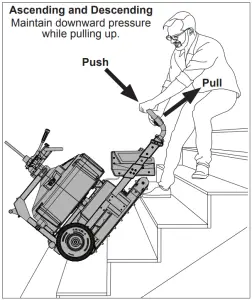 - When descending, roll the wheels out past the edge to engage the treads. Pull up the incline and push the handle down into the surface. Allow the Lift Assist to help move the machine. Guide the treads using the transport handle. Maintain downward pressure. Allow the POWERTREDZ™ LIFT ASSIST to pull itself down.