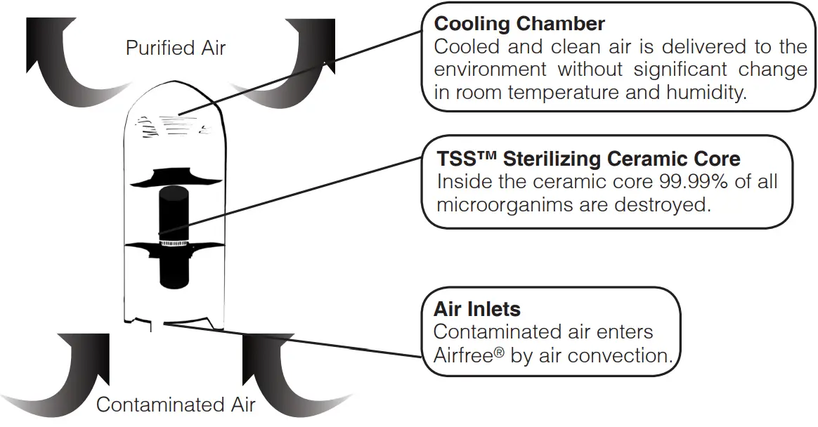 Those microscopic microorganisms are easily eliminated inside Airfree’s ceramic core