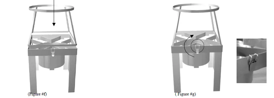 - Slowly reopen the regulator valve ¼ turn. Gas will immediately flow through the system. Light the burner from the bottom, keeping hands and face away from the top of the cooker. (Figure #j)
