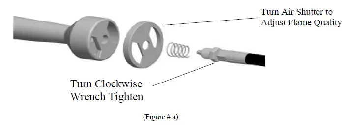 1. Insert the hose with brass connector through the spring and the air shutter into the receptor hole on the burner. Turn the brass connector clockwise into the threads of the receptor and tighten with a wrench. (Figure #a)