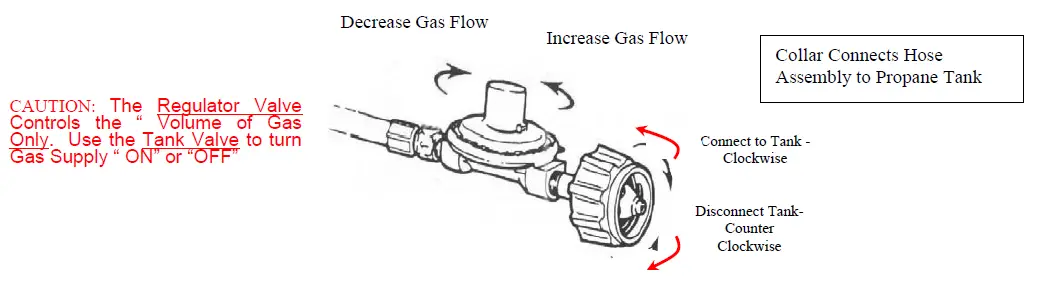 - Use regulator valve only to adjust the flame. Use tank valve to turn the cooker ON and OFF. When finished cooking, or in case of an emergency, turn the tank valve clockwise to the “OFF” position. Be sure to close the tank valve before disconnecting the hose.