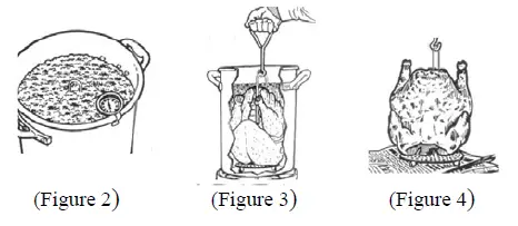 - Attach grab hook to the top loop of the poultry rack. Very slowly and carefully lower the turkey into pot. (Figure 2) Wear mitts for protection. Then, remove grab hook from rack. (Figure 3)