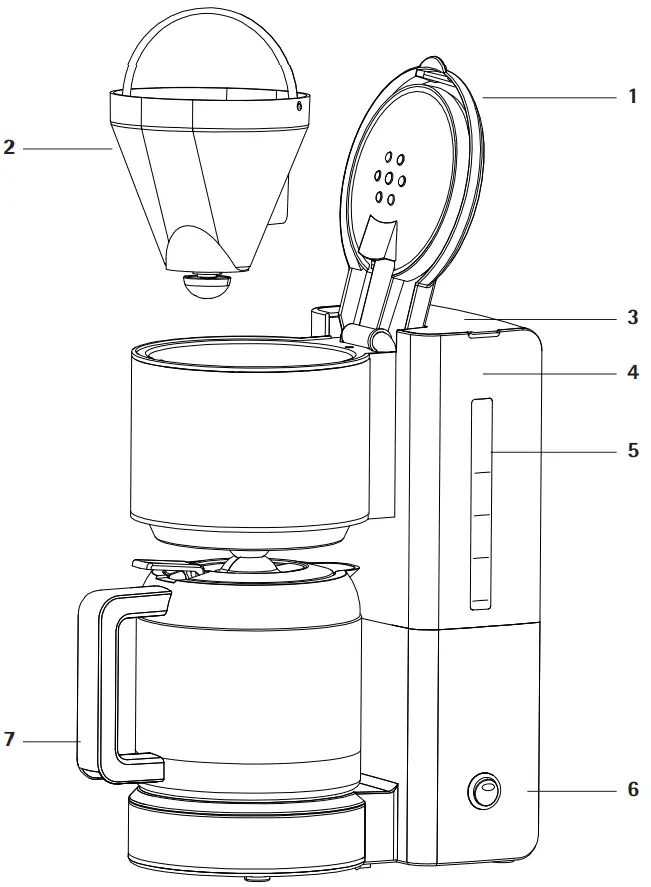 Open the water tank (4). To do so, swing open the lid (3) upward. Only pour cold water into the tank (4). The water level indicator (5) is for the amount of fresh water that is needed to brew the desired number of cups per 125 ml of coffee.