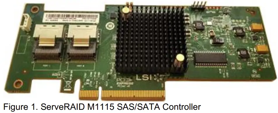 The ServeRAID M1115 SAS/SATA Controller is a low-cost RAID 0/1/10 solution that can be upgraded to a cacheless RAID 5 with a Features-on-Demand license upgrade. The M1115 is a part of the ServeRAID M Series family that offers a complete server storage solution consisting of RAID controllers, cache/flash modules, energy packs, and software feature upgrades in an ultra-flexible offerings structure. Figure 1 shows the ServeRAID M1115 Controller.