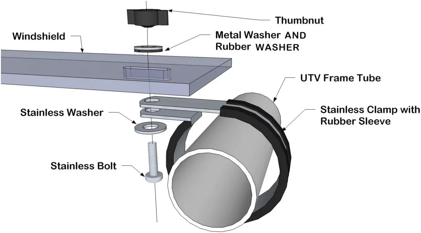 - Take the remaining hardware and install the windshield to the roll cage as shown in the diagram below.