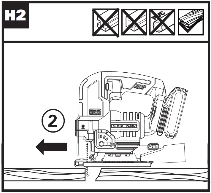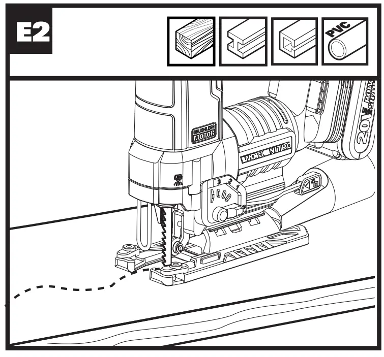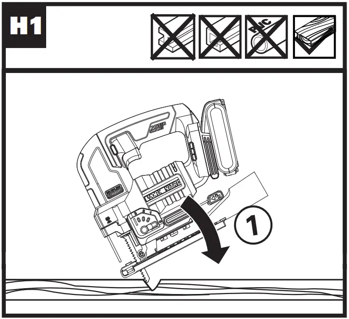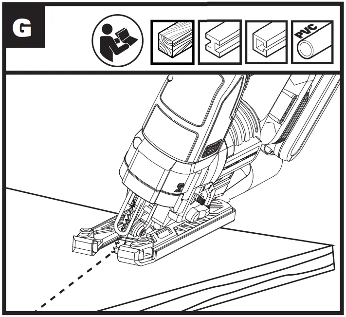 Always ensure the workpiece is firmly held or clamped to prevent movement. Any movement of the material may affect the quality of the cut. The blade cuts on the upward stroke and may chip the uppermost. Ensure your uppermost surface is a nonvisible surface when your work is finished.