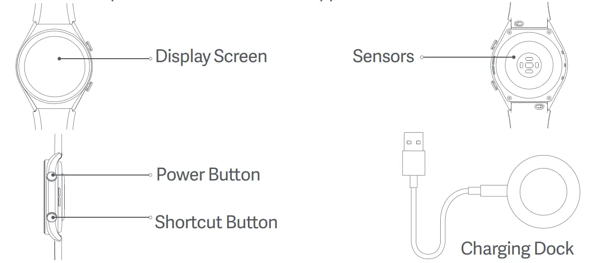 - Keep the power adapter, charging dock, and watch in a dry environment while charging. Do not touch the power adapter or charging dock with wet hands. Do not expose the power adapter, charging dock, and watch to rain or other liquids.