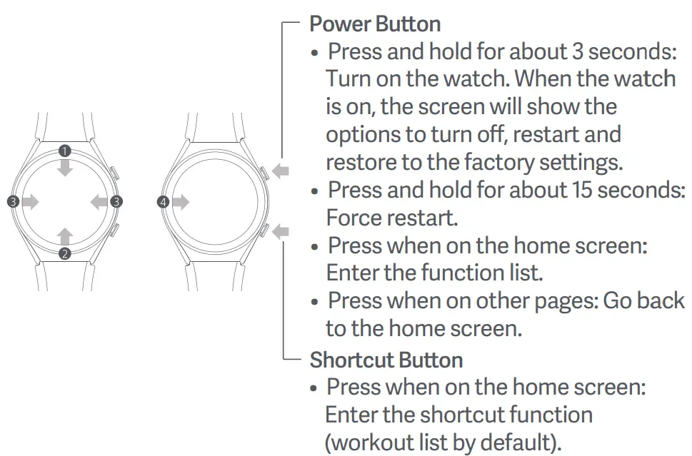 - The touchscreen of the watch does not support underwater operations. When the watch comes into contact with water, use a so cloth to wipe away excess water from its surface before use.