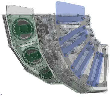 In order to create both vertical and horizontal arrays, external fixed hardware accessories are required. In both cases, the loudspeakers must always be connected on both sides with the dedicated accessory plates provided by Outline (the transparent blue ones in the image below) or with external hardware, structure. The external hardware must be approved by a licensed professional engineer.
