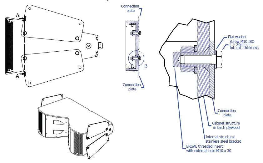 For the vertical array it is possible to use either a load-bearing structure or lifting devices such as eyebolts. The bearing structure must be designed according to the local laws and local safety factors, considering the total load of the system, the dynamic factors inducted by vibrations, winds and mounting procedures (responsibility of the installer). If eyebolts are used, with Outline plates, please check the load capacity before the installation (The maximum capacity, indicated in kg, on the eyebolts refers to the straight throw; the capacity for the orthogonal pull at 90° is indicated on the package label).