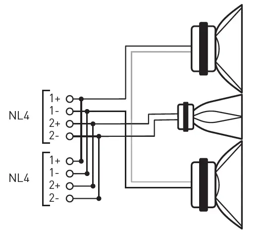 The connections are available on two NL4 speakON connectors.The mid-low frequency section is using pin 1+/1- while the high frequency section is using pin 2+/2-.