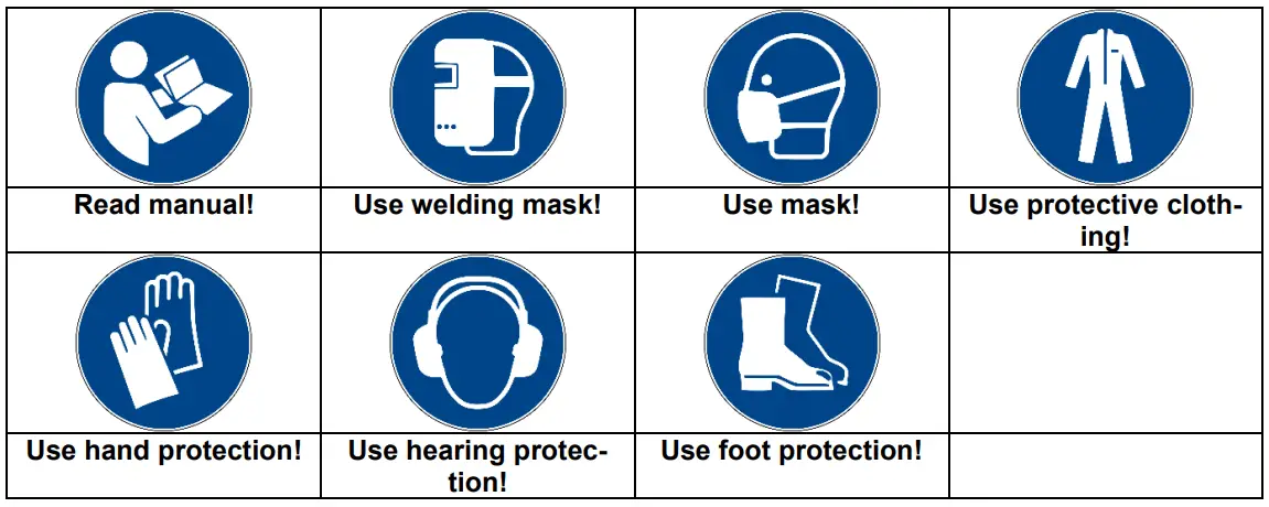 - Persons or assistant near the welding arc must be informed about the dangers and be equipped with the necessary protection means; if necessary, mount protective panels.