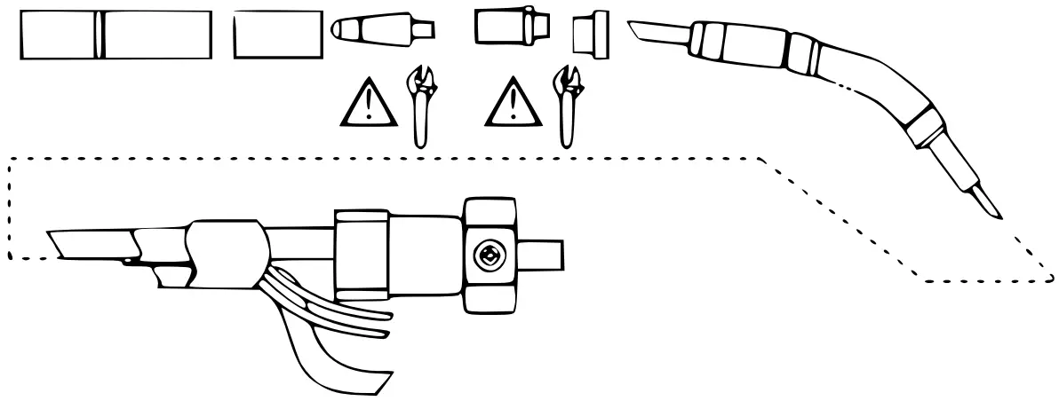 - Reattach the components of the welding gun. Tighten the contact tip and adaptor with a wrench.
