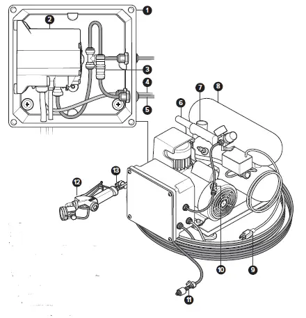 | Discharge line length/diameter | 50 ft. (15.2 m) twin-line tubing 1/4 in. (6.4 mm) outside diameter |