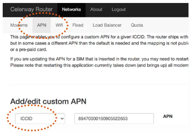 3. If the SIM card requires a special APN, copy the ICCID number for the Modem