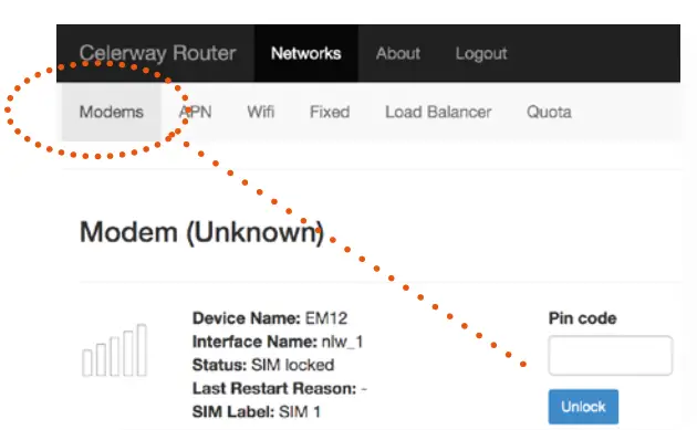 2. In the Modems menu, enter the SIM card’s pin code in the Pin code field and click Unlock.