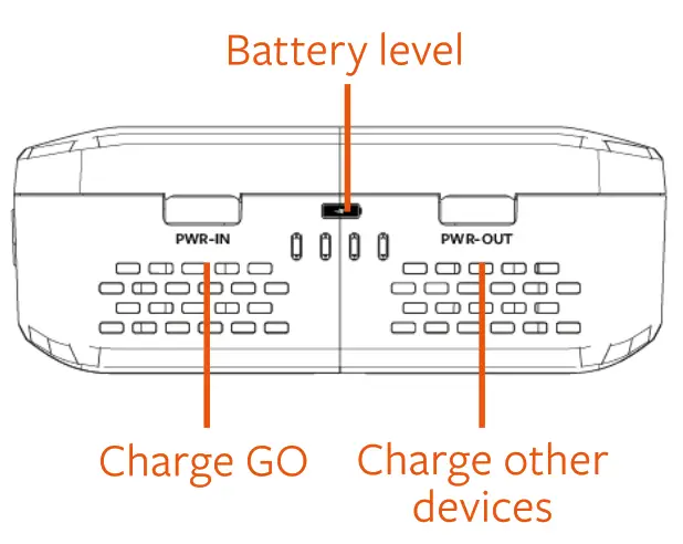 If you press and quickly release the power button, you can check the battery level as indicated by the 4 LEDs under the battery icon. The battery is fully charged when all 4 EDs are illuminated. Should you need to charge GO, use only the original charging equipment from Celery. Stop charging GO when its battery is fully charged. For more information on charging GO safely, see Normal battery usage and Observe battery safety guidelines.