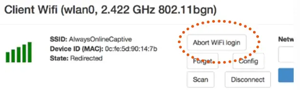 C 5. If the login is not successful for any reason, click Abort WiFi login to abort the process to enable Internet connectivity again.