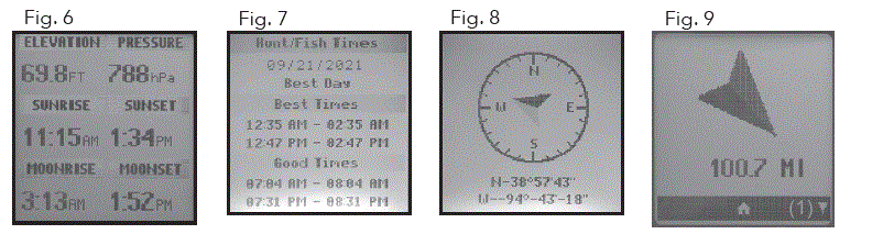 - To return to the location you marked, press the Power button (1) to return to the home screen. Press the Select key (2) to see your current location’s Elevation, Pressure, Sunrise, Sunset, Moonrise, and Moonset from the home screen. (Fig. 6)From the Elevation screen, press the Toggle Up or Down buttons to see the Hunt/Fish Times. (Fig. 7)Press Select (2) to view the Compass screen (Fig. 8), displaying the Latitude and Longitude of your current location, and a Digital Compass Display (Fig. 9) including your heading (direction of travel) in degrees. Fig. 6 Fig. 7 Fig. 8 Fig. 9