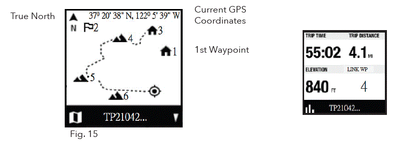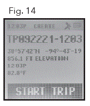 - On the Create screen, select START TRIP (Fig. 14) to create a Trip from one Waypoint to another you have linked and are in the range of your current location. If “NO WAYPOINT” is shown, there are no saved Waypoints available. You will see point coordinates, elevation, and temperature on this screen. The Trip with linked Waypoints will appear.