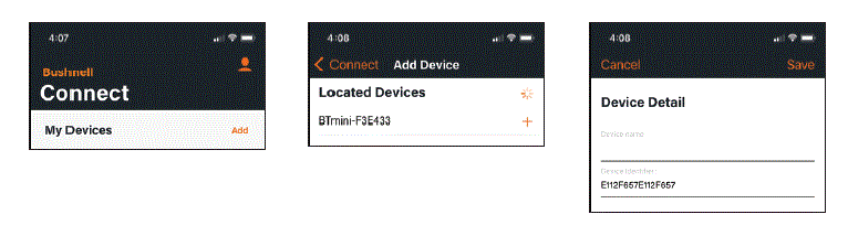 - Go into the Bushnell Connect app and connect the device by selecting the plus sign button below the picture of thedevice. After the BackTrack Mini is connected, it will need to be given a name in your list of devices in Bushnell Connect. Do this on the Device Detail screen.