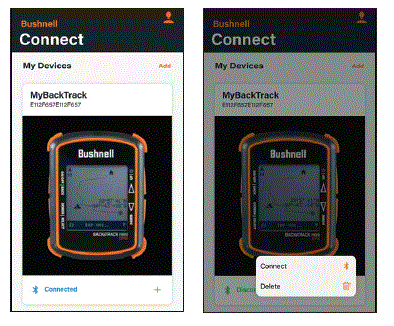 - Additional BackTracks or other Bushnell devices can be added or deleted. Connect or disconnect your device from Bluetooth from this screen. To go to the main page for the BackTrack Mini, press on the picture of the device.