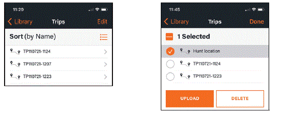 Choosing Trips in the Library menu allows the user to see the synced trips organized by date or name. The factory default is to save the Trip (TP) or Waypoint (WP) by the date created. (TP110721-1124 = Trip started on November 7, 2021 at 11:24am) To upload a Trip or Waypoint, select Edit, select the Trip or Waypoint to upload to the BackTrack Mini, and press UPLOAD.