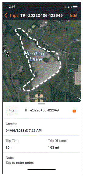 - Select a Trip to view the trip detail page. The Trip detail page shows the track of the trip overlaid on the smartphone default map. This page shows the data created, trip time, distance, and added notes. Share this trip with friends through text messaging or email. (See instructions on Page 7)