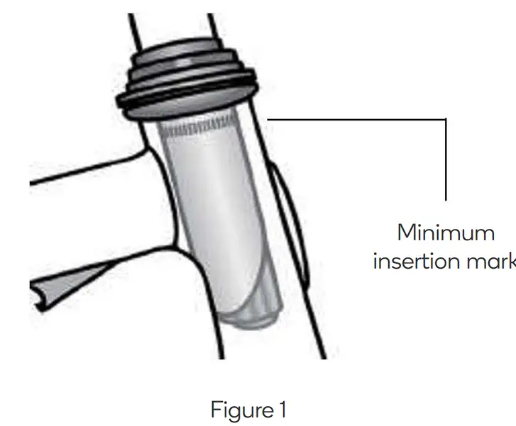 - Insert at least to the minimal indication on the seat stem using rotary movements. You can use grease to help assembly.
