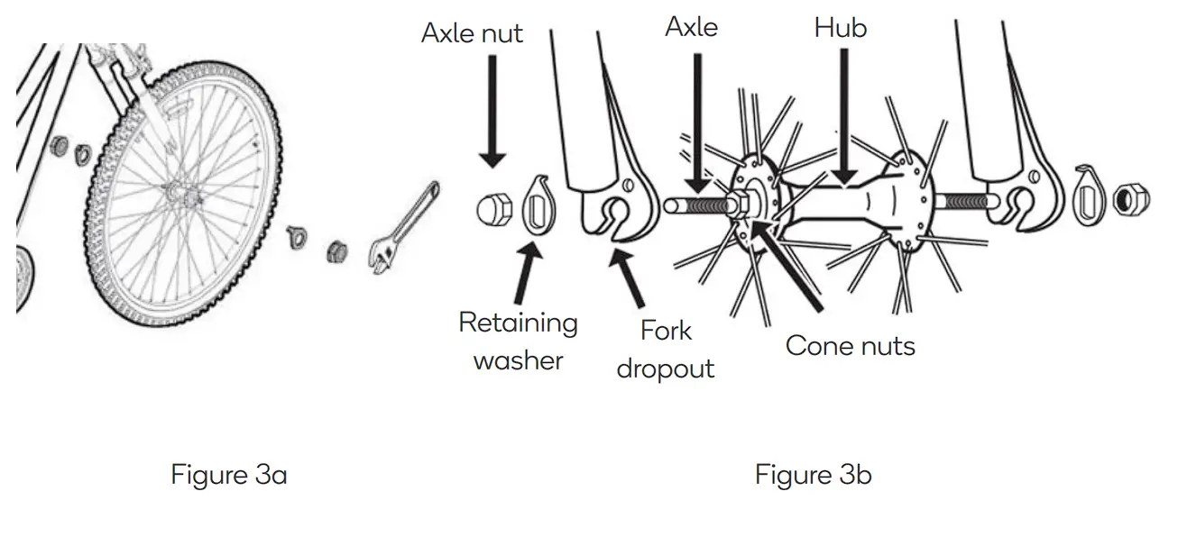 - Attach the front wheel with retaining washer in place and tighten the axle nuts securely.