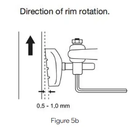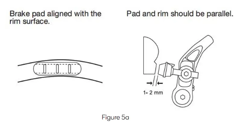 The brake pads should be adjusted so they are 1-2mm away from the rim when the brakes are not applied (Figure 5a).