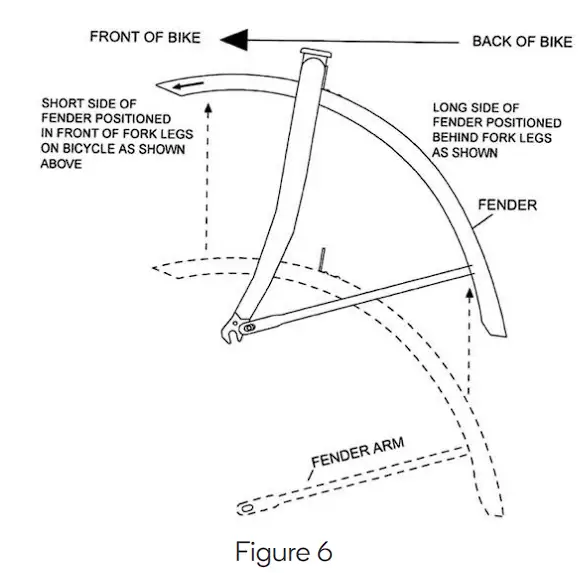 - Attach fender arms (align the fender arm holes with the mounting holes on the fork end) then insert the mounting bolts through the fender arm holes to secure the bolts into the fork holes.