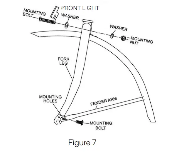 - Slide a washer onto the mounting bolt and insert through fork and fender bracket. Place the other washer and front light onto the mounting bolt and secure the mounting nut as shown (Figure 7).