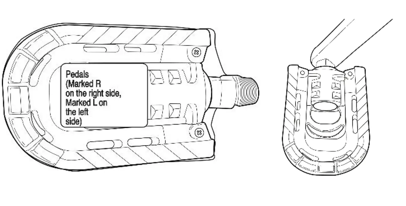 Install the pedal marked “L” on the left crank and tighten, then install the pedal marked “R” on the right crank and tighten.