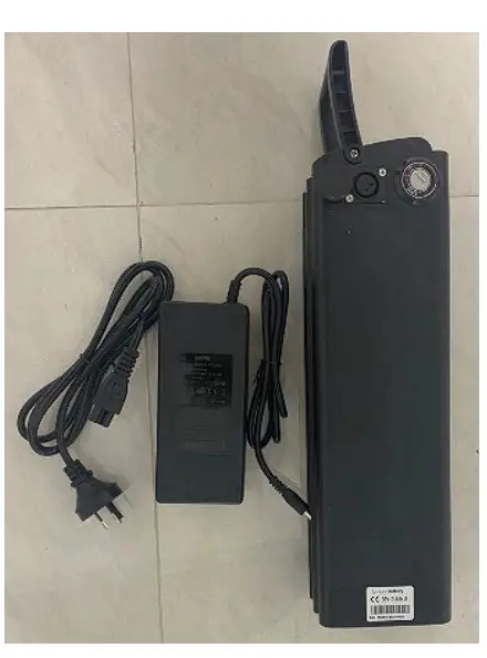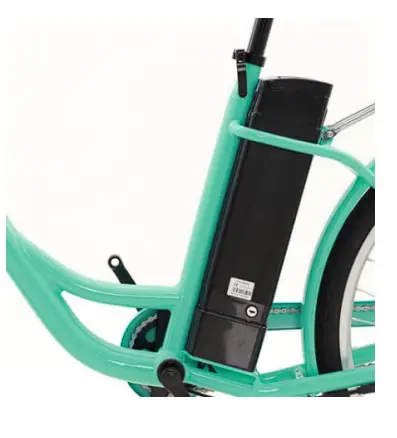 Install: Press the button under the seat and fold the seat forward. Align the slot on the bottom of the battery with the track on the bike frame, then slide the battery into position, as shown below. Insert the key and turn it clockwise twice to the ON position then fold the seat back into position. The bike is now ready for use.