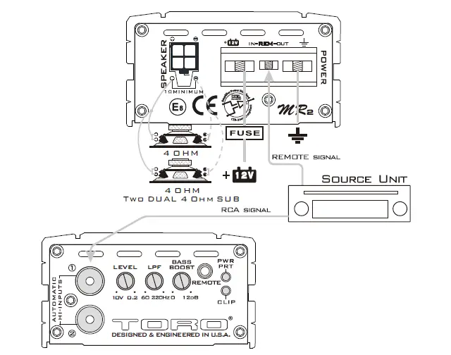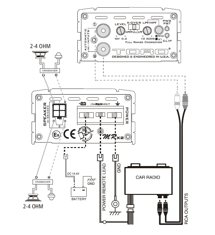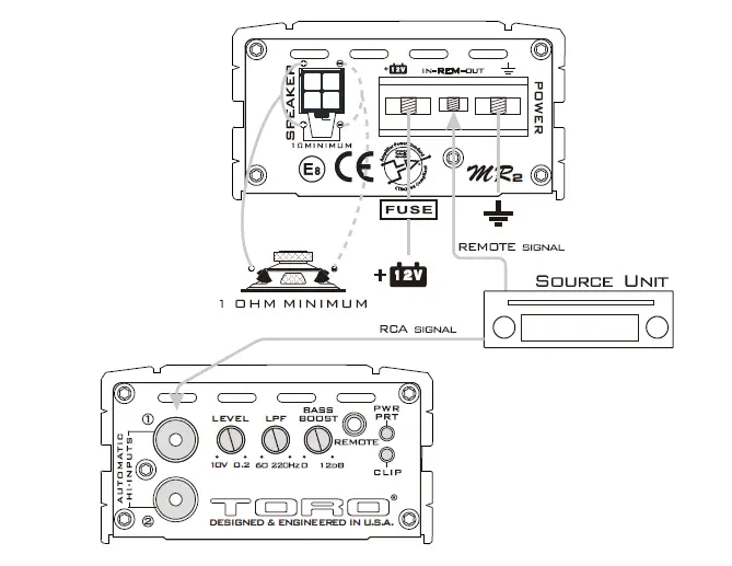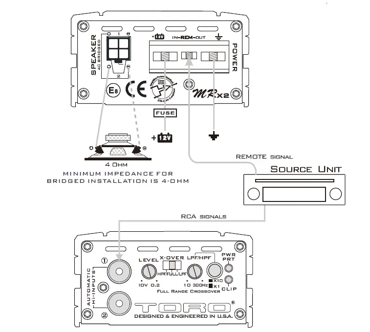 Installation of TORO TECH mobile amplifiers requires detailed knowledge of electronic wiring and proper speaker impedance. We strongly recommend installation by an authorized TORO TECH dealer or certified MECP installer. This Owners Manual only provides general installation and operation instructions. If you have any reservations about your installation skills, please contact your local TORO TECH dealer for assistance. IMPORTANT: