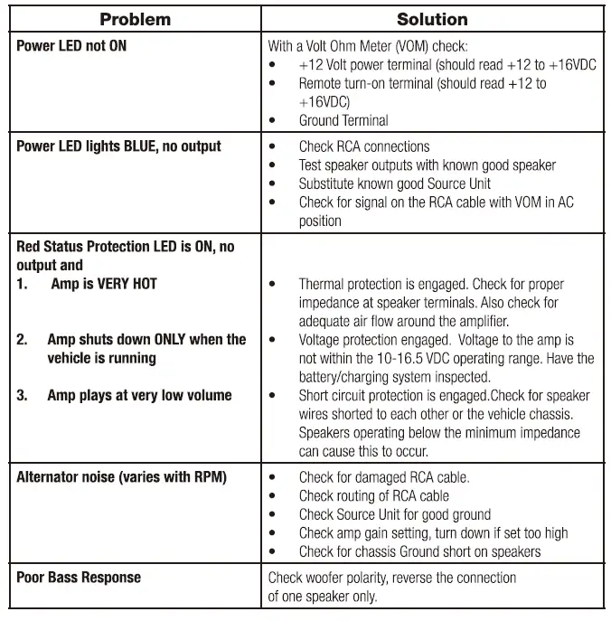 This amplifier is designed for operation in vehicles with 12-Volt negative ground electrical systems only.