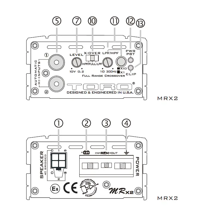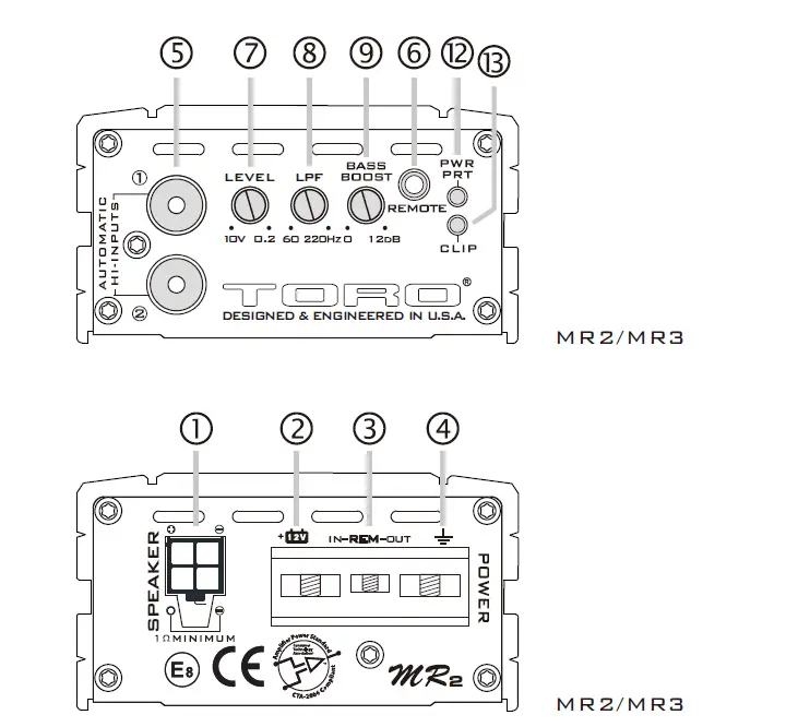 Models MRX2,MRX4 are full-range Class-D multi-channel amplifiers specifically designed for mid-range or mid-bass speakers and sound quality subwoofer systems.Models MR2 and MR3 are Class-D Mono Block amplifiers designed specificity for low frequencies and are intended only to power subwoofers.It is important that you closely follow the wiring instructions contained in this Owners Manual so that you get the most from your TORO TECH Micro Rage amplifier.