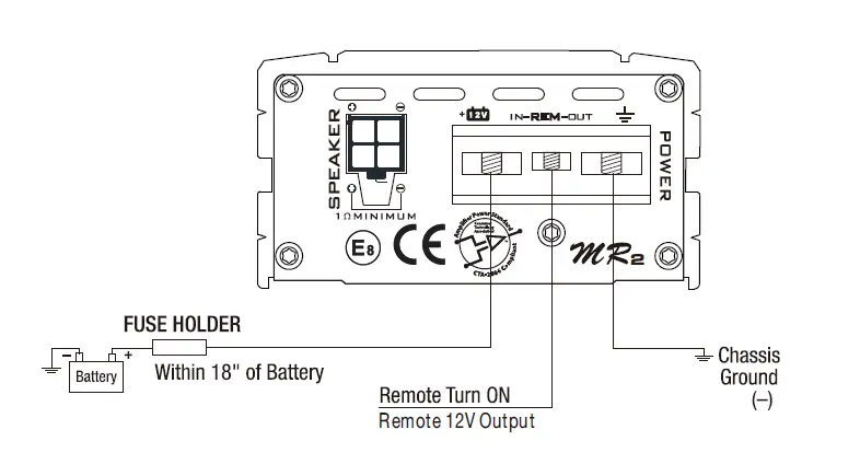 - The DC power wire must be fused at the battery positive (+) terminal connection before making or breaking power connections at the amplifier power terminals, disconnect the DC power wire at the battery end.