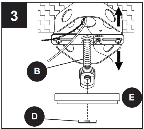 ![]() | Unscrew nut D from screw collar loop C. Attach A to outlet box using AA. Temporarily place E through B to determine amount of adjustment necessary for B. Use pliers (not included) to tighten locking nut on B until locking nut touches A |