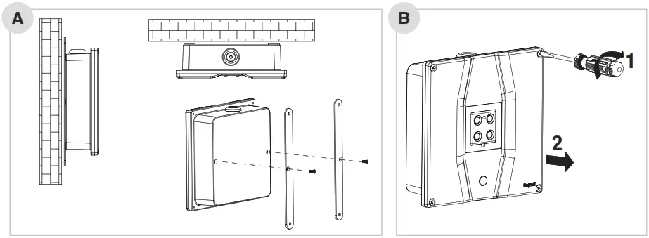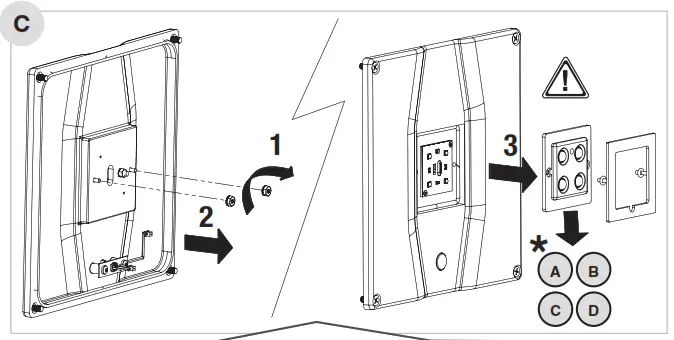 1 -the little label should be positioned on the plant drawing for easy tracing of the luminaire (picture B); 2 -the medium and large labels should be positioned on the luminaire where the radio device is mounted in a way to be visible when the luminaire is installed (picture B1).