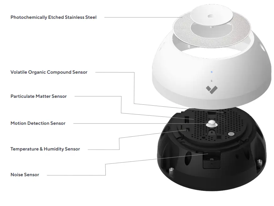 Verkada’s SV11 uses multiple onboard sensors to detect and measure vapring events. Combined, these sensor readings output Verkada’s Vape Index, which determines the likeliness of vaping/smoking occuring on a scale of 1-100.